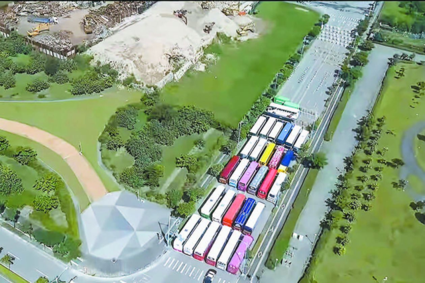 台军在公路上用客车部署的“防御工事”